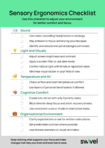 Download the checklist here to support clearer focus throughout your day: Sensory Ergonomics Checklist.