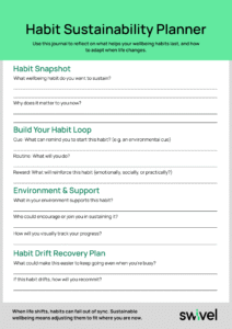 The Habit Sustainability Planner helps you reflect on why your wellbeing habits work, what makes them stall, and how to recommit when life changes. It’s a practical way to track what fits and what needs adapting.
