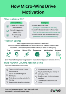 This infographic breaks down the science of the motivation loop: how an action can trigger a dopamine boost, reinforce habits, and build momentum. Use it to understand why micro-wins matter and get inspired to spot your own.