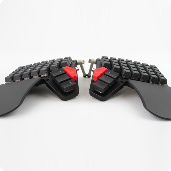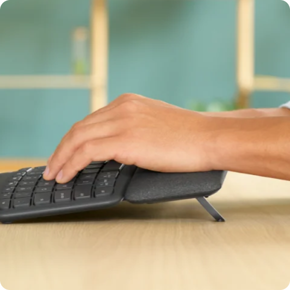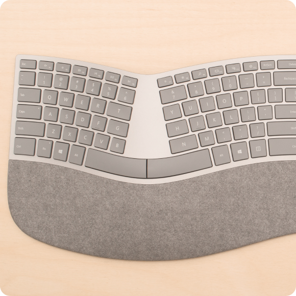 Angled key configuration encourages naturally straight wrist posture and potential comfort for some users. Adjustable designs available.