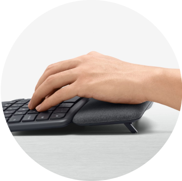 Downward sloping angle away from the user reduces wrist extension. Feature can reduce forearm muscle fatigue and improve comfort when typing .