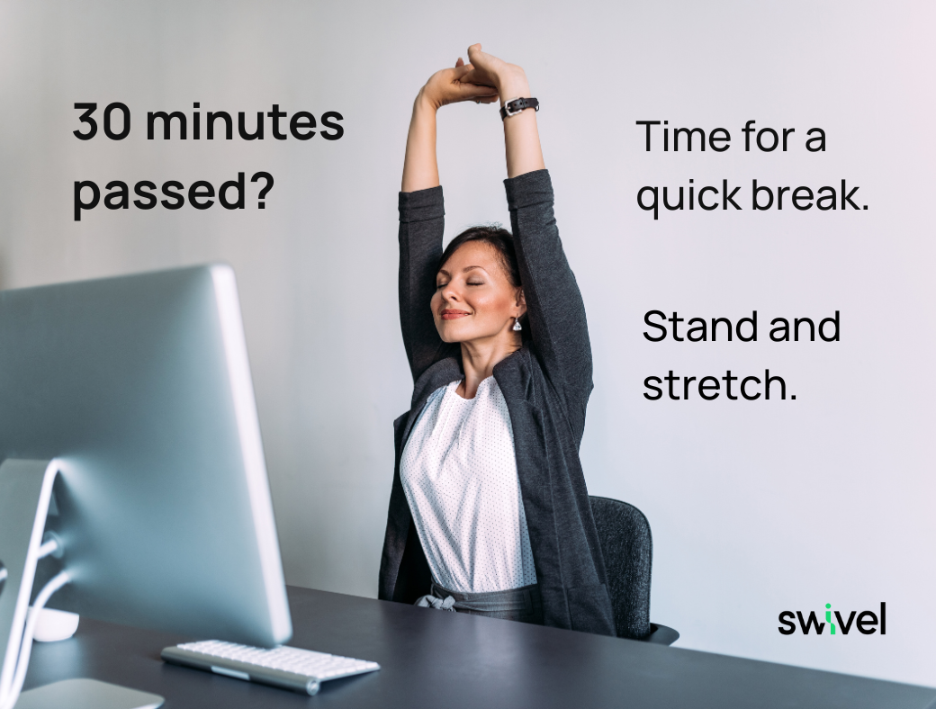 A gentle reminder to pause every 30 minutes. Stand, stretch, and recharge in under a minute.
